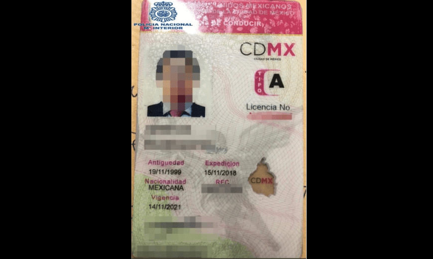 El documento, cuya fotografía difundió la Policía Nacional de España, contiene la tipografía de la Ciudad de México y el diseño que usaba la pasada administración, con una presunta fecha de expedición, 15/11/2018, y una vigencia hasta el 14/11/2021.