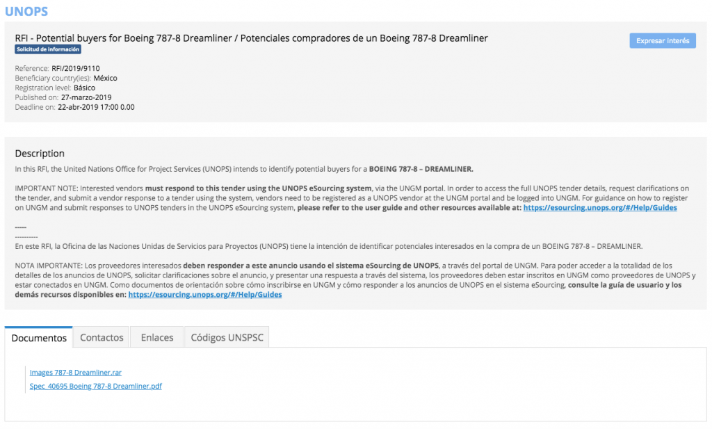 La oferta publicada por las Naciones Unidas, a través de su portal para proveedores United Nation Global Market (UNGM por sus siglas en inglés), incluye una hoja con información y especificaciones técnicas de la aeronave, así como una serie de fotografías del avión presidencial.