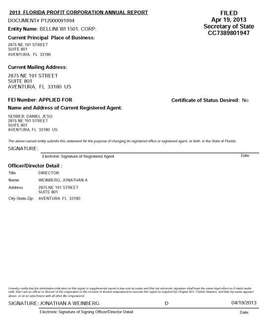 A menos de 2 meses de haber finalizado el sexenio calderonista, una sociedad de responsabilidad limitada registrada en Florida por Alexis Weinberg adquirió una residencia con un valor de 35 millones de pesos. Esta lujosa propiedad ubicada en el número 21400 de la avenida NE 38 unidad #54 en Aventura, es la misma propiedad que según directorios públicos señalan como residente a Linda Pereyra. En agosto de 2016 esta propiedad fue vendida a Alexis Elías y a la hermana de Salomón Chertorivski según consta en los documentos públicos en poder de este reportero.