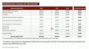 De acuerdo al INEGI por mes, se registra un promedio mensual de 11,870 muertes, por diabetes la cifra es de 8,704; por tumores se reportan 7,541 decesos; por complicaciones del sistema digestivo la cifra es de 5,648, por accidentes es de 3,442, incluso por influenza y neumonía es de 1,994 al mes, mientras que por COVID-19, en abril, se registraron 2,177 decesos.