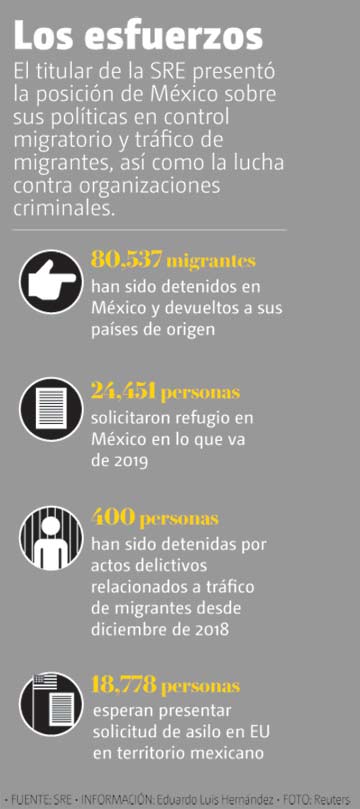 En conferencia desde la embajada de México en Washington, el canciller detalló que de diciembre de 2018 a mayo pasado se rescató a 80 mil 537 personas en territorio mexicano y se les regresó a sus países de origen, se aceptó a 8 mil 835 migrantes retornados de EU, que están en espera de una audiencia de asilo, y 18 mil 778 esperan en un puerto de entrada en la frontera.