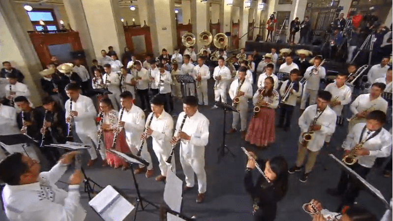 Luego de su gira por Quintana Roo, el presidente Andrés Manuel López Obrador este lunes entregaró instrumentos musicales a siete bandas de músicos indígenas oaxaqueños, que desde las cinco de la mañana llegaron a Palacio Nacional para recibirlos.