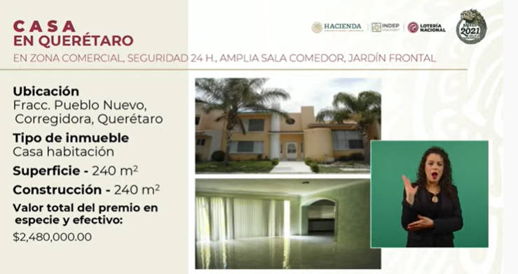 “Tenemos un total de 22 premios: ocho de la Ciudad de México, cinco de Baja California, dos de Jalisco, dos de Guanajuato, uno de Querétaro, uno de Sinaloa, uno en Morelos y dos en Guerrero, de los cuales ocho son casas habitación, siete departamentos, cinco terrenos, un rancho y un palco en el Estadio Azteca”, informó Margarita González, directora general de la Lotería Nacional, durante la conferencia matutina de AMLO desde Palacio Nacional.