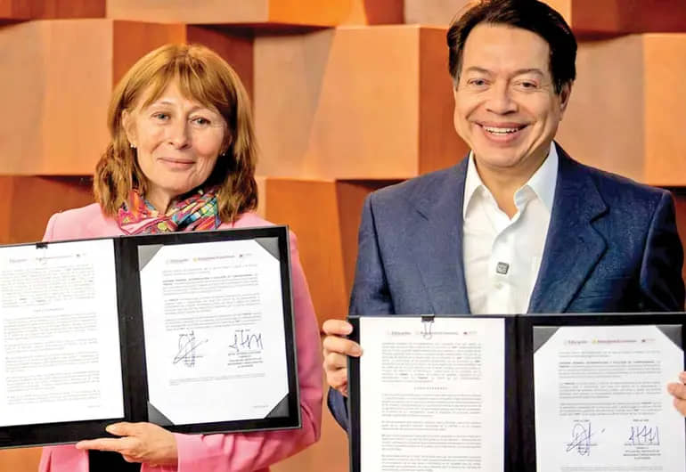 El secretario de Educación Pública, Mario Delgado Carrillo, y la titular del Instituto de Mexicanas y Mexicanos en el Exterior (IMME), Tatiana Clouthier Carrillo, firmaron un acuerdo de colaboración destinado a ampliar las oportunidades educativas para las y los mexicanos que viven fuera del país o que han regresado recientemente. El convenio también busca fortalecer la enseñanza del español, la identidad cultural y el bilingüismo.