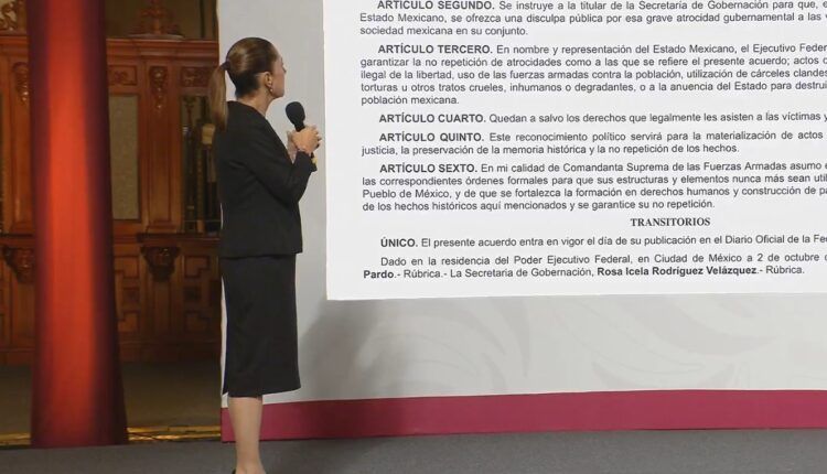 La presidenta destacó que la secretaria de Gobernación, Rosa Icela Rodríguez, ya había ofrecido disculpas públicas en nombre del Estado mexicano por lo que calificó como una “grave atrocidad gubernamental”. Estas disculpas se extendieron a las víctimas directas, a sus familias y a la sociedad mexicana en su conjunto. Sheinbaum reiteró su solidaridad con los familiares y las víctimas —muchas de ellas ya fallecidas—, así como con todos los presos políticos, manteniendo siempre el canal de diálogo con la Secretaría de Gobernación.