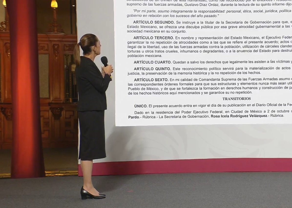 Durante su intervención en Palacio Nacional, la mandataria hizo memoria del decreto publicado hace un año en el Diario Oficial de la Federación. Dicho documento reconoce de manera política que los violentos actos gubernamentales perpetrados en 1968 contra el heroico movimiento estudiantil constituyeron un crimen de lesa humanidad. Sheinbaum recordó que este hecho fue admitido incluso por el entonces presidente Gustavo Díaz Ordaz en su momento.