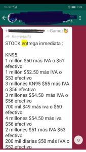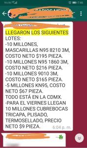 “Pago en efectivo o transferencia + IVA. Para dar la prueba de vida se necesita la prueba de fondos. Todo se hace por videollamada. Después de que cliente y vendedor vea que todo está bien nos dan la hora y lugar exacto”, se promete. Otra oferta resalta en el chat: 40 millones de cubre bocas 3M 1860 en 179 + IVA. Comisión de 1 peso. Urge”.