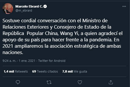“Sostuve cordial conversación con el ministro de Relaciones Exteriores y Consejero de Estado de la República Popular China, Wang Yi, a quien agradecí el apoyo de su país para hacer frente a la pandemia”, manifestó el canciller.