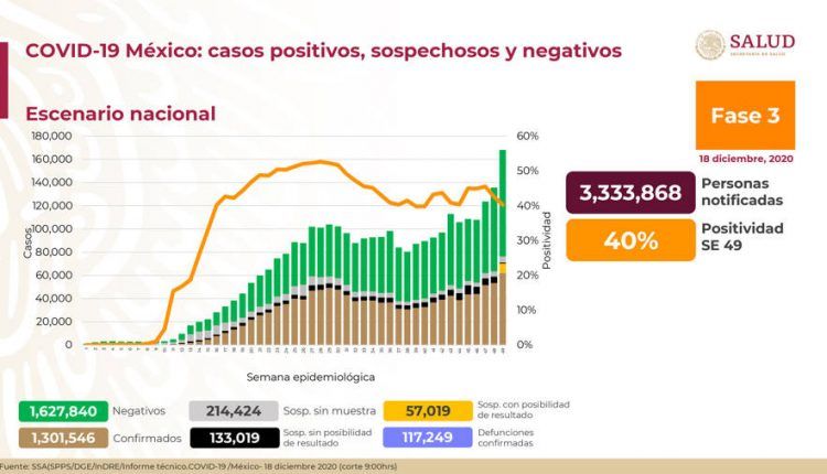Las autoridades de Salud dieron a conocer, la noche del lunes 18 de diciembre de 2020, que los casos confirmados acumulados en México ascendieron a 1 millón 301 mil 546 y los negativos a 1 millón 627 mil 840.