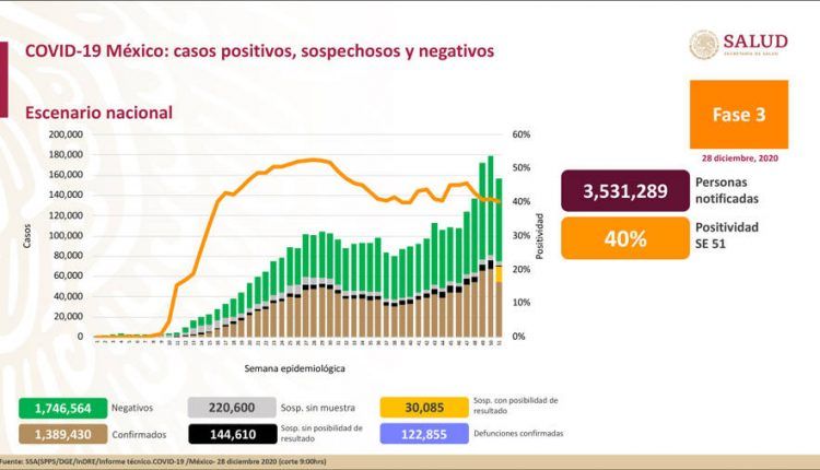 Las autoridades de Salud dieron a conocer, la tarde del lunes 28 de diciembre de 2020, que México ya alcanzó 1 millón 389 mil 430 casos confirmados y 1 millón 746 mil 564 negativos, así como 122,855 defunciones confirmadas