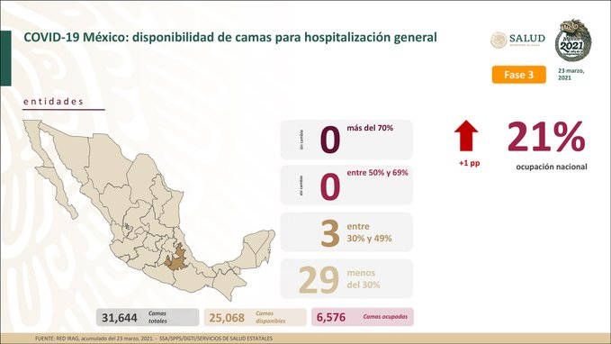 En tres estados se registra una ocupación de camas de hospitalización general que va del 30 al 49%, mientras que en los restantes es menor al 30%.