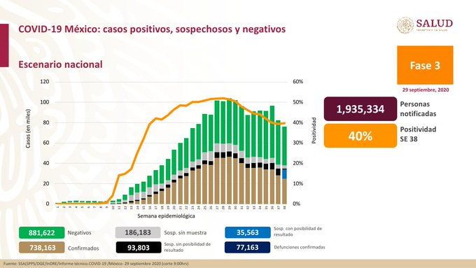 Autoridades de la Secretaría de Salud informaron este martes que los casos confirmados a Covid-19 alcanzan los 738 mil 163.