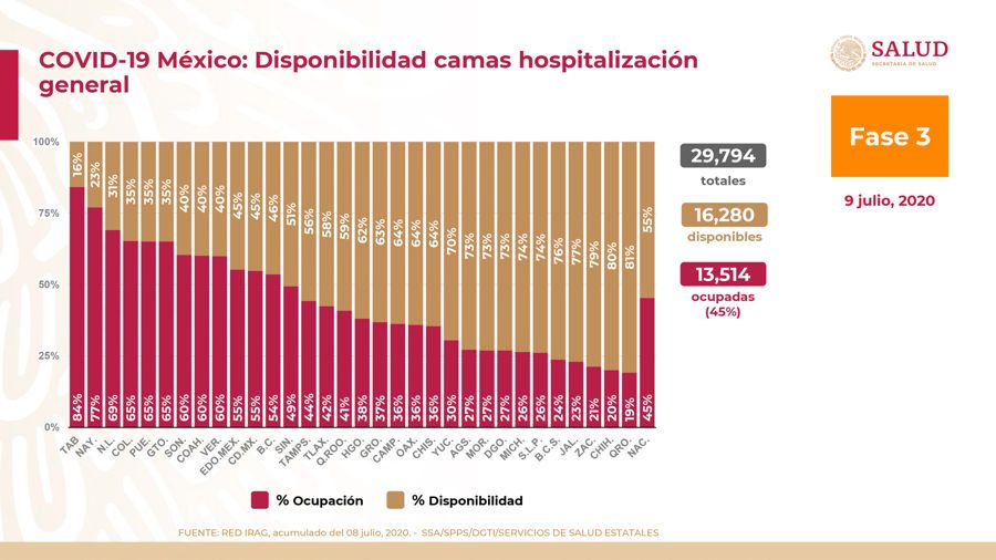 A nivel nacional, 55% de camas de hospitalización general están disponibles y 45% ocupadas. En camas con ventiladores, 63% están disponibles y 37% ocupadas. 2/2 pic.twitter.com/tuPPSocaJ8
