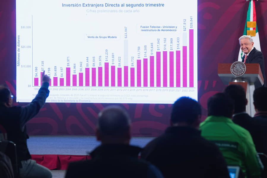 En conferencia de prensa matutina indicó que la Secretaría de Economía reporta la recepción de 29 mil 041 millones de dólares en el primer semestre por concepto de Inversión Extranjera Directa, lo que representa una cifra histórica.