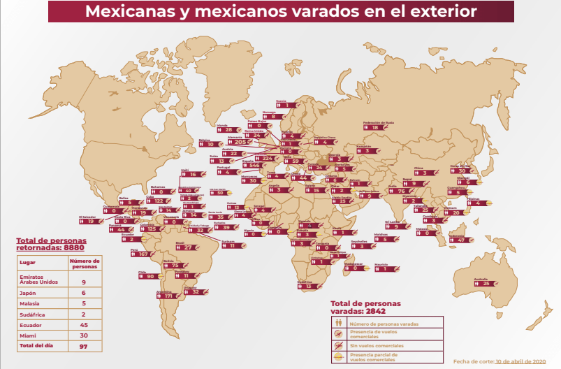 Hasta el día de hoy, la Secretaría de Relaciones Exteriores reportó un total de 2,842 mexicanos varados en distintas partes del mundo, y 8880 personas retornadas.