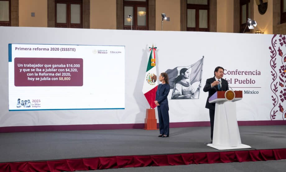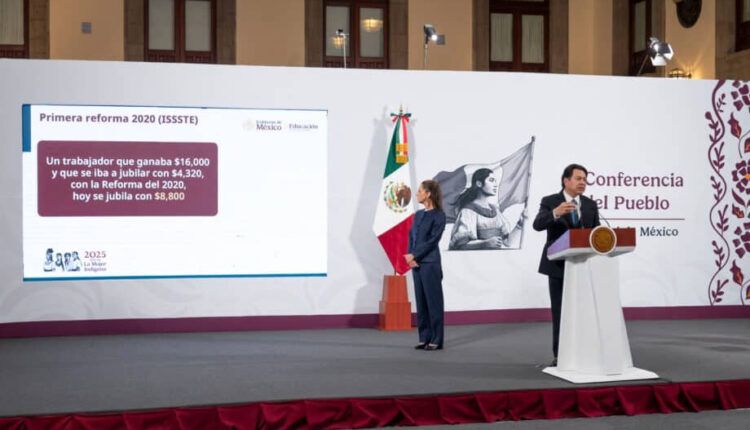 Explica que con la reforma del ISSSTE de 2007, quienes se jubilaban y ganaban alrededor de 16 mil pesos, solo tenían más de 4 mil pesos de pensión, pero esto cambió en 2020, durante la administración del presidente Obrador con la aprobación de una reforma al ISSSTE para que las jubilaciones alcanzaran más de 8 mil 800 pesos.