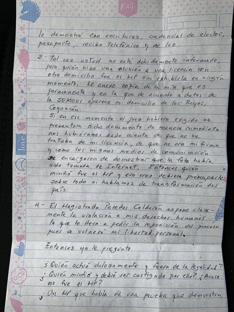 En la misiva, Robles Berlanga reitera que se ha conducido con respeto a la ley, confiando en la autonomía del Poder Judicial de la Federación y deja claro que nunca ha mentido sobre su domicilio, el cual ha acreditado con documentos y testimonios.