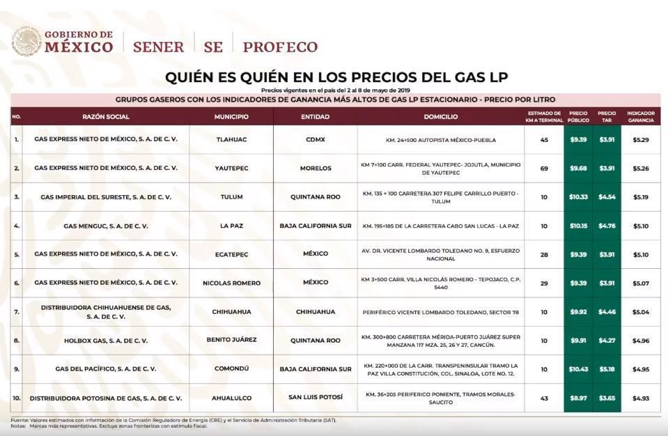 El procurador Federal del Consumidor dijo que los grupos caseros con los indicadores de ganancia más altos de Gas LP estacionario-precio por litro- se encuentran: