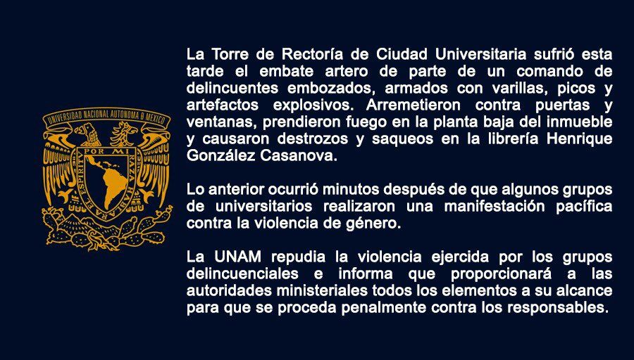 En un comunicado, la UNAM detalló que “la Torre de Rectoría de Ciudad Universitaria sufrió esta tarde el embate artero de parte de un comando de delincuentes embozados, armados con varillas, picos y artefactos explosivos causando destrozos al edificio”.