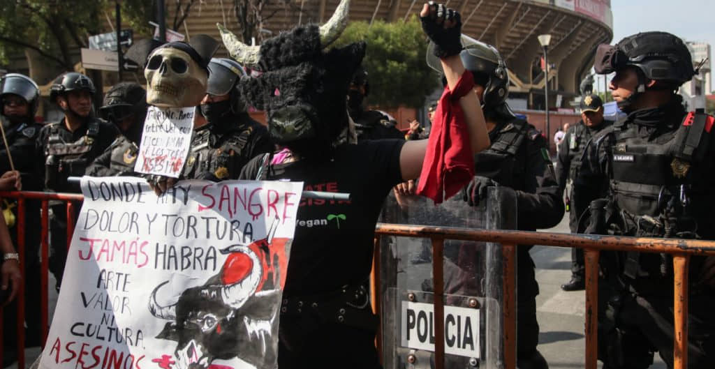 Decenas de personas se manifestaron este 28 de enero en calles aledañas a la Plaza México, de la capital de la República, para protestar en contra del regreso de las corridas de toros.