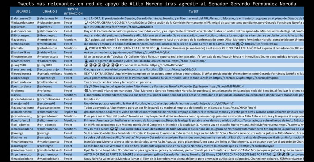 Luego de que el senador y dirigente del PRI, Alejandro Moreno, agrediera al presidente de la Mesa Directiva de la Comisión Permanente, Gerardo Fernández Noroña, y a uno de sus colaboradores, las redes sociales se llenaron de supuestos mensajes de apoyo para Alito Moreno, sin embargo, un estudio realizado por el analista digital Carlos Augusto Jiménez, dichas interacciones fueron creadas por cuentas bots.
