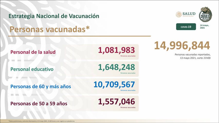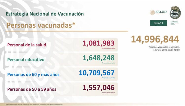 La Secretaría de Salud a nivel federal, informó la tarde de este viernes 14 de mayo que se han vacunado en México contra Covid-19 a 14,996,844 personas.