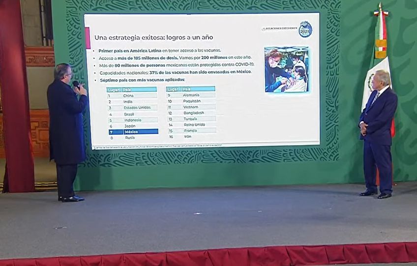 Asimismo, destacó el titular de la SRE, nuestro país es el séptimo a nivel internacional con más dosis contra SARS-CoV-2 aplicadas, sólo por debajo de China, India, Estados Unidos, Brasil, Indonesia y Japón.