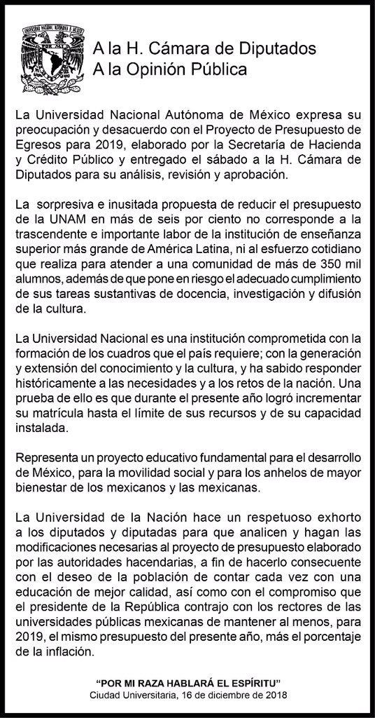“No tengo conocimiento sobre el comunicado de la UNAM. Lo que sí puedo decirles, en general, es que se va a hacer más con menos”, respondió esta mañana Andrés Manuel López Obrador ante la pregunta expresa sobre el comunicado que emitió la UNAM con respecto al riesgo que tendrían las tareas de docencia, investigación y difusión cultural en caso de reducir el presupuesto en un 6%.