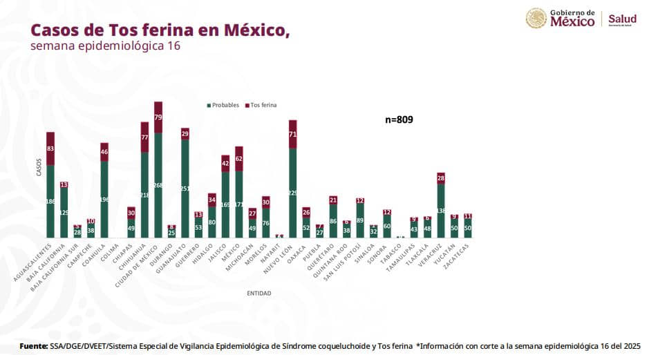 En relación con los casos confirmados de Tos ferina, David Kershenobich apuntó que se han registrado 48 defunciones en menores de un año edad y del total de casos distribuidos en 15 entidades, la mayor parte se concentra en la Ciudad de México y Nuevo León.
