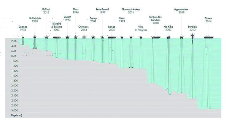 El concepto de aguas profundas se refiere a cuerpos de agua con tirantes de 500 a 1,500 metros desde la superficie al lecho marino. En el caso de las aguas ultraprofundas, su hondura comienza a partir de los 1,500 metros en adelante.
