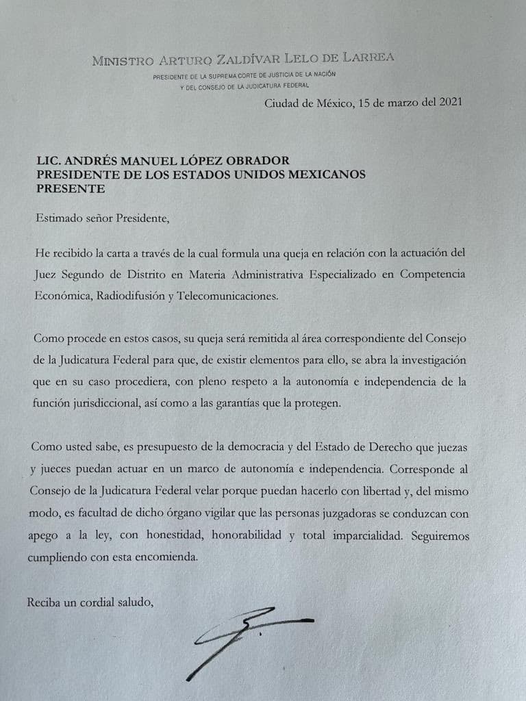 “Como procede en estos casos, su queja será remitida al área correspondiente del Consejo de la Judicatura Federal para que, de existir elementos para ello, se abra la investigación que en su caso procediera, con pleno respeto a la autonomía e independencia de la función jurisdiccional, así como las garantías que la protegen”, desatacó Arturo Zaldívar, en la misiva difundida en la cuenta de Twitter del Consejo de la Judicatura Federal.