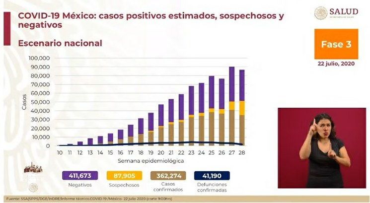 En la conferencia vespertina en Palacio Nacional, José Luis Alomía, director de Epidemiología de la Secretaría de Salud, indicó que la estimación sobre el número de personas que han enfermado asciende a 404 mil 92 , como resultado de sumar los confirmados al porcentaje de sospechosos que se prevé serán positivos al virus SARS-CoV-2. Equivale a una disminución de seis por ciento entre la semanas epidemiológicas 27 (del 28 de junio al 4 de julio) y 28 (del 5 al 11 de julio).