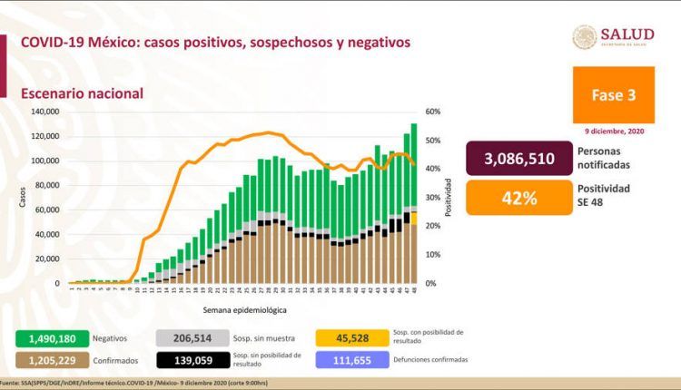 La Secretaría de Salud informó que al 09 de diciembre de 2020 hay 1,205,229 casos confirmados #COVID19. Se han registrado 1,490,180 negativos, 111,655 defunciones confirmadas y 889,168 personas recuperadas.