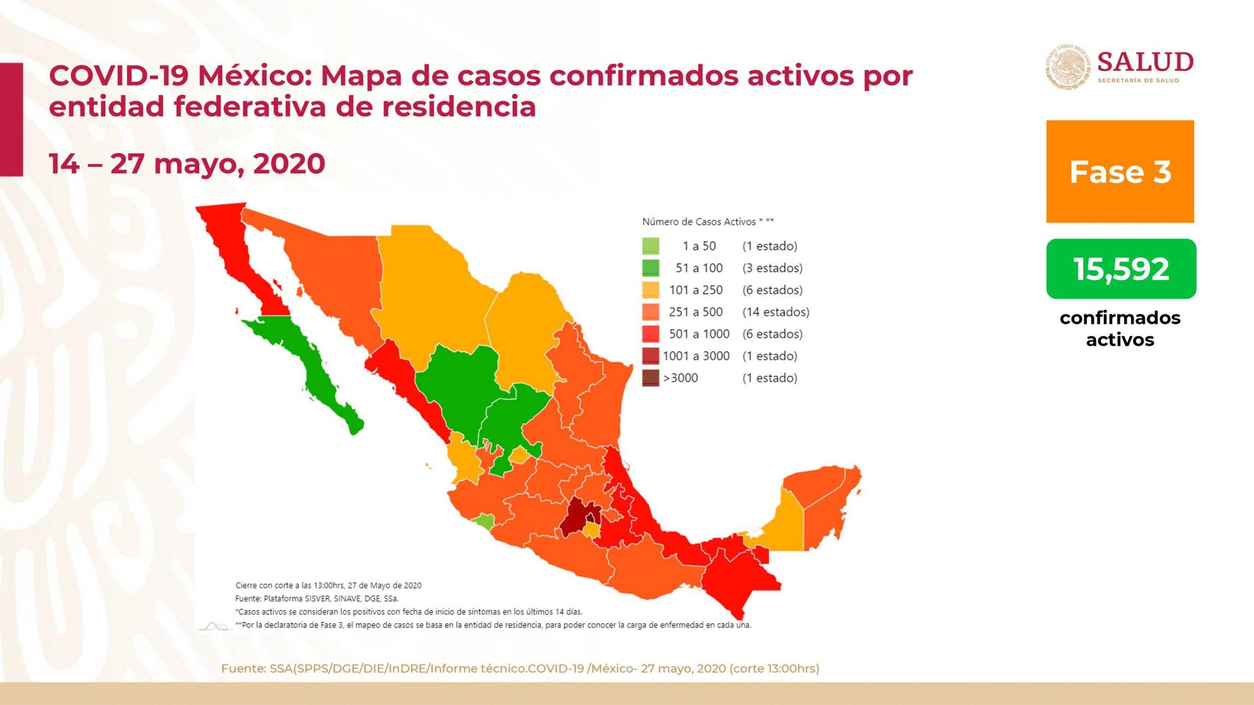 En la conferencia de prensa de esta tarde, las autoridades de salud informaron que en México al 27 de mayo de 2020 hay 78,023 casos confirmados, 15,592 confirmados activos y 33,566 sospechosos por Covid-19.