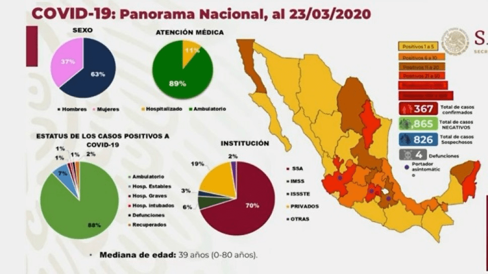 El subsecretario de Salud, Hugo López-Gatell, indicó que ya son 367 casos confirmados de COVID-19 y la cifra de defunciones es de cuatro.
