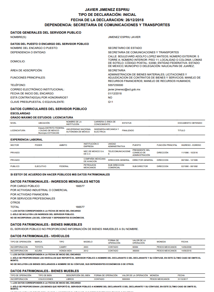 Javier Jiménez Espriú, secretario de Comunicaciones y Transportes, omitió en su declaración de bienes que es dueño de un departamento en Houston, Texas, reportó este lunes el diario Reforma. El inmueble tiene un valor aproximado de 6.6 millones de pesos y unos 158 metros cuadrados.