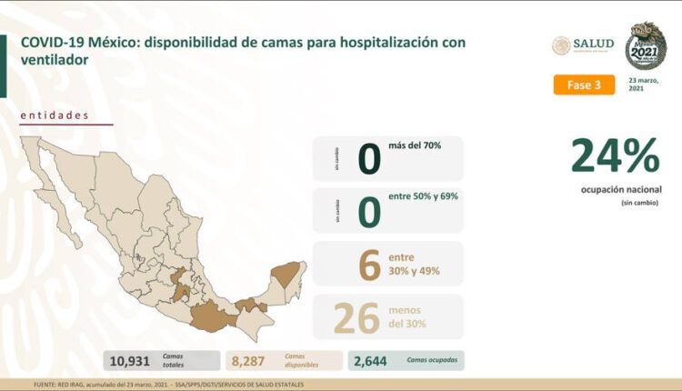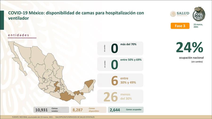 En cuanto a la ocupación de camas de hospitalización general y de camas con ventilador es del 21% a nivel nacional, y la ocupación de camas de hospitalización general es del 20% a nivel nacional.
