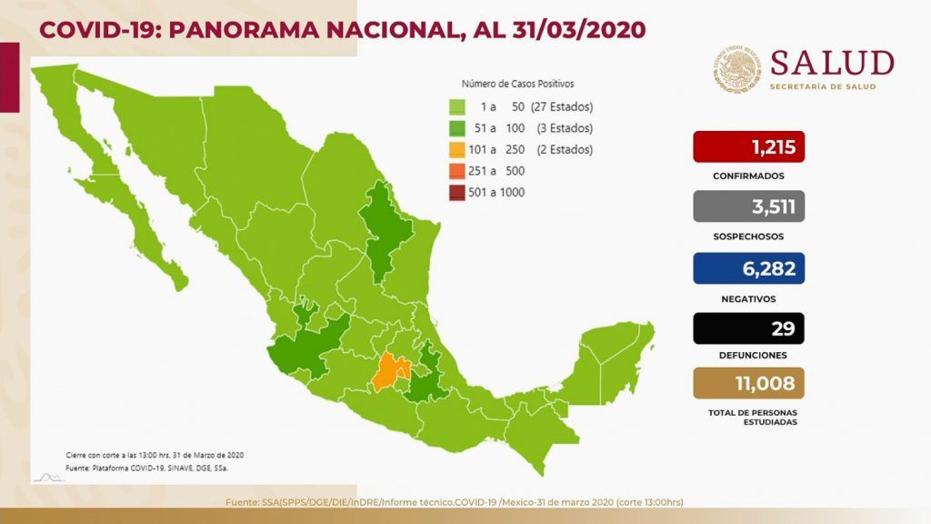 En México suman 29 muertos y mil 215 casos positivos de coronavirus, de acuerdo con el reporte de hoy 31 de marzo de 2020 de la Secretaría de Salud.