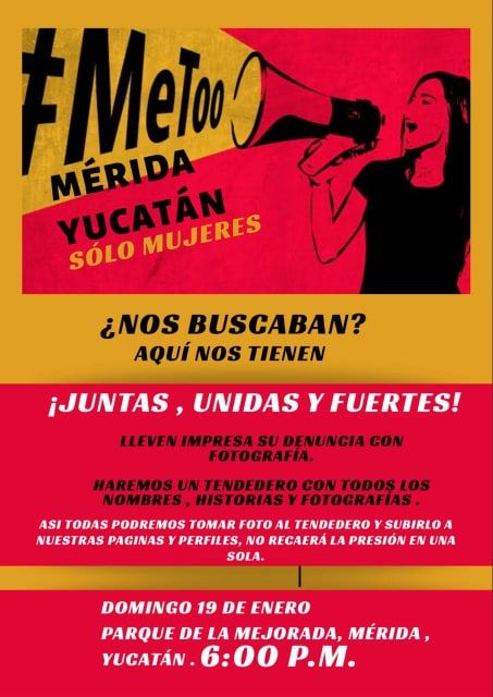 La violencia ejercida sobre las mujeres en Yucatán ha quedado de manifiesto con la creación y desaparición de la cuenta de Twitter @metoomerida y la cuenta de respaldo @metoomerida2 que en un par de días han registrado decenas de publicaciones sobre acoso, abuso y violación. En Mérida, las mujeres ya se preparan para manifestarse de forma pública este domingo 19 de enero en el Parque de La Mejorada a las seis de la tarde, para mostrar su apoyo a las denuncias que se han estado publicando en esa red social bajo el lema “¿Nos buscan? Aquí nos tienen.