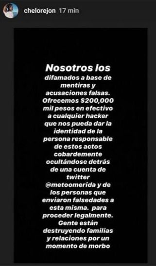 Algunos nombres se repitieron de manera constante como el de Chelo Rejón, quien ofreció 200 mil pesos a “cualquier hacker que nos pueda dar la identidad de la persona responsable”, se leía en una “historia” en su perfil de Facebook.
