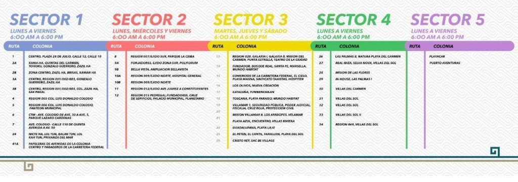 Debido al mantenimiento de las unidades recolectoras de basura en el municipio de Solidaridad, la municipalidad anunció un programa de recoja de deshechos sólidos con horarios y zonas establecidas, el cual consistirá en: