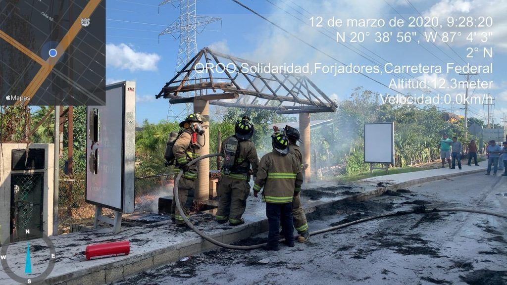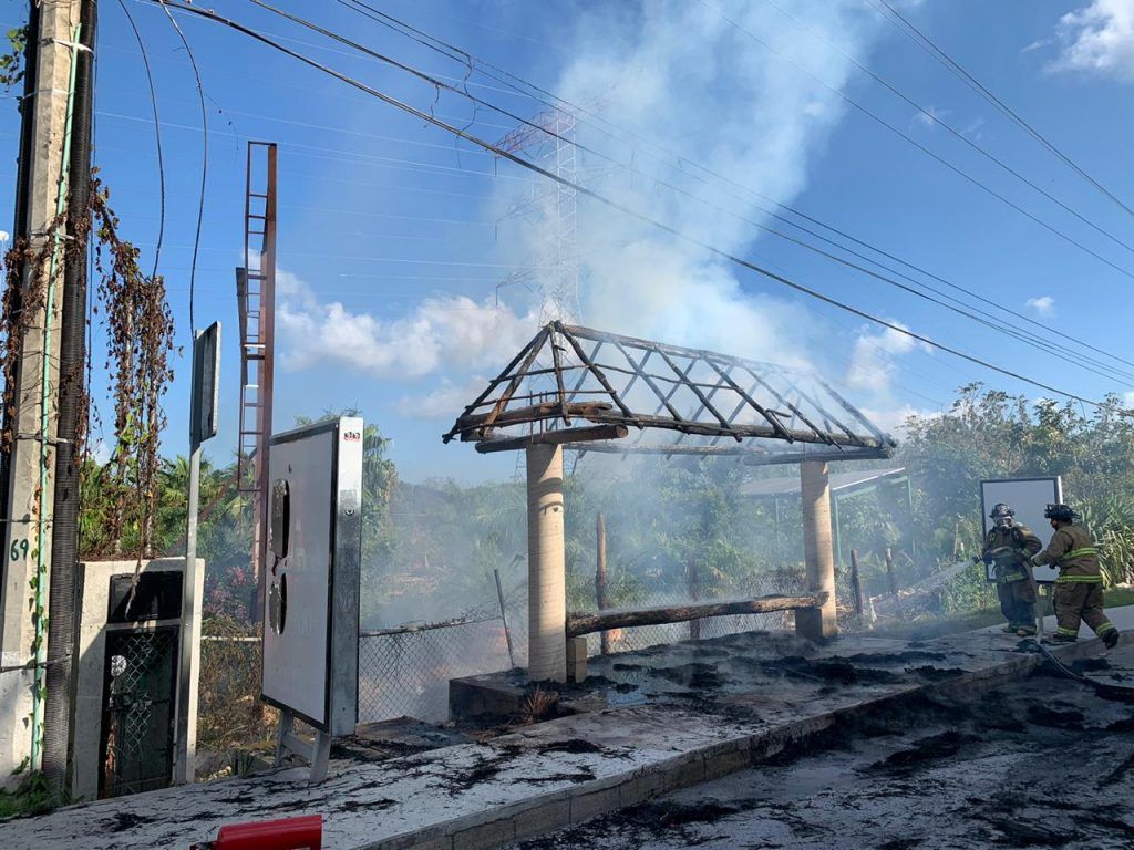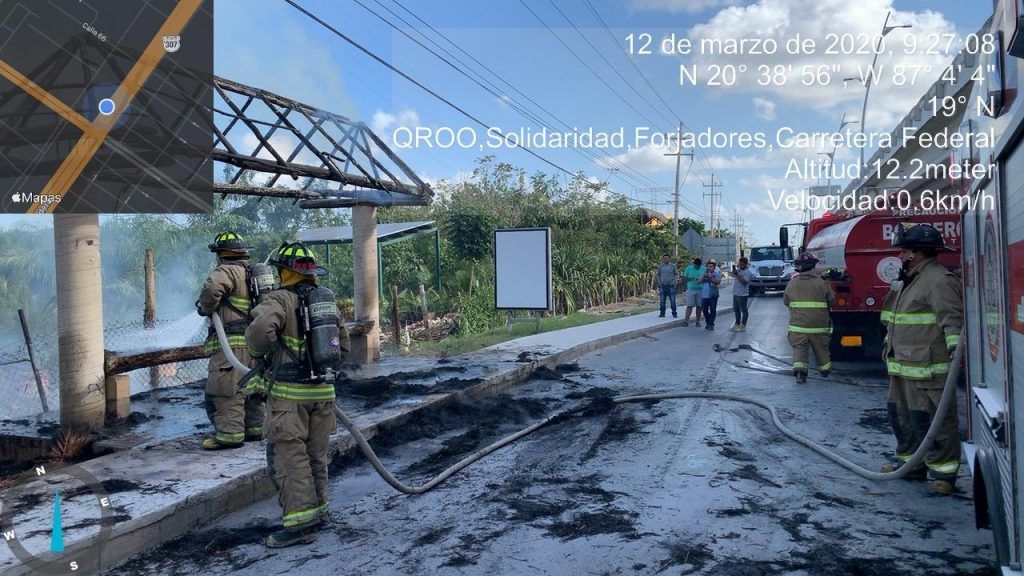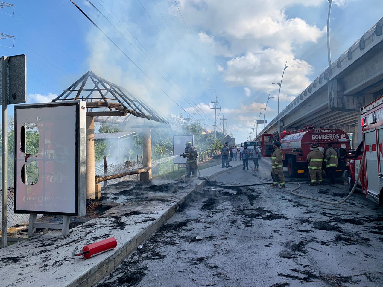 La Secretaría de Protección Civil, Prevención de Riesgos y Bomberos atiende de forma inmediata el incendio de una palapa en el paradero ubicado sobre la carretera federal y Avenida Colosio.