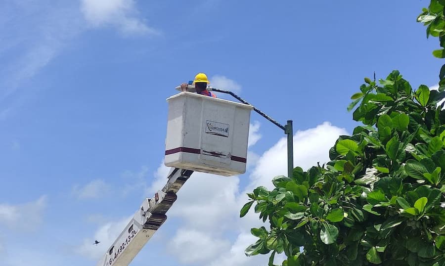 “Son ocho cuadrillas que están trabajando con el mismo número de grúas, 12 horas diarias, para cumplir la meta de modernizar el alumbrado y llegar a Puerto Maya, en Puerto Aventuras, donde daremos prioridad porque hay demanda de este servicio”, precisó.