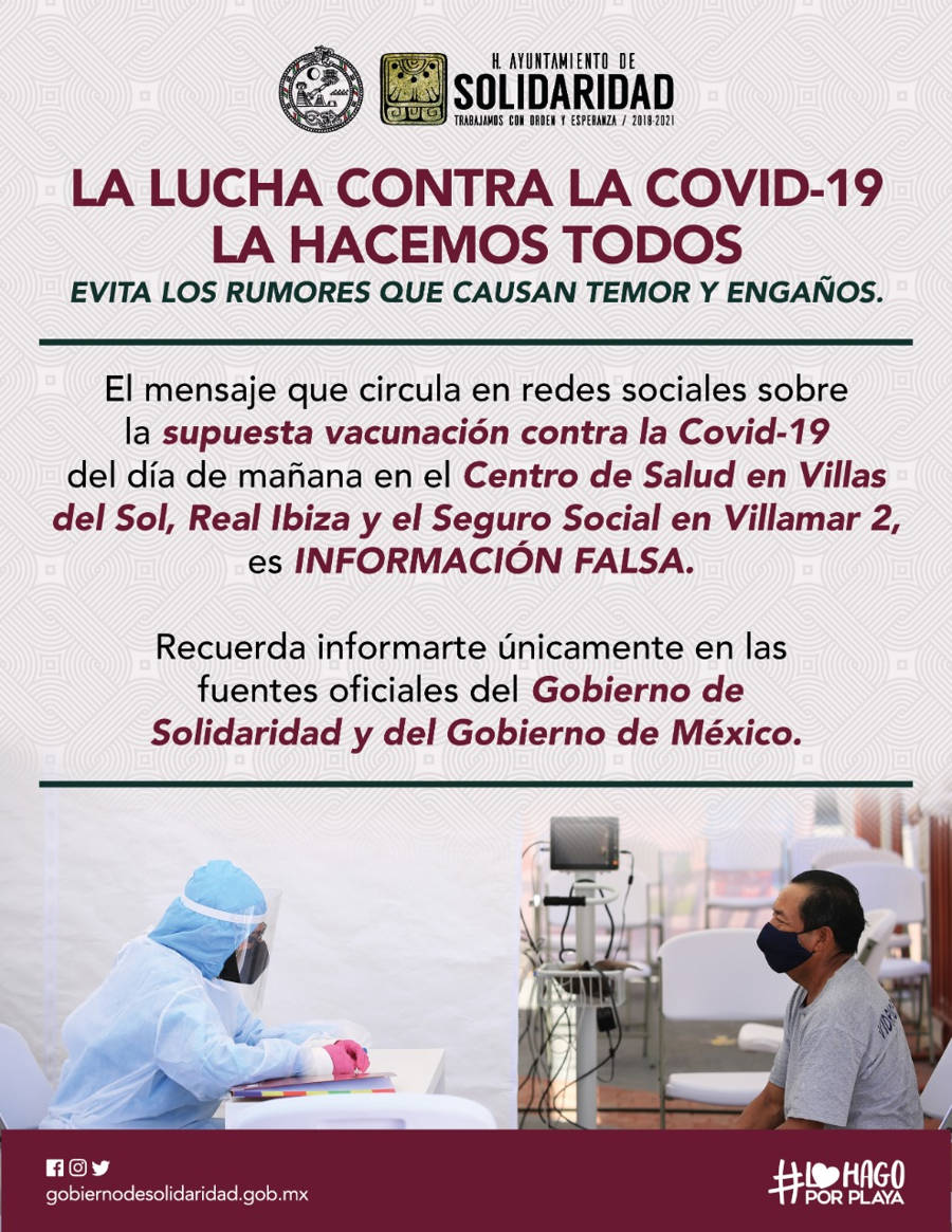 El Gobierno de Solidaridad informó que será el próximo municipio donde se aplicarán las vacunas contra la COVID-19, exclusivamente a adultos mayores de 60 años, con residencia en esta localidad; sin embargo, serán las autoridades federales y estatales quienes determinarán las fechas, horarios y metodología para la aplicación del biológico.