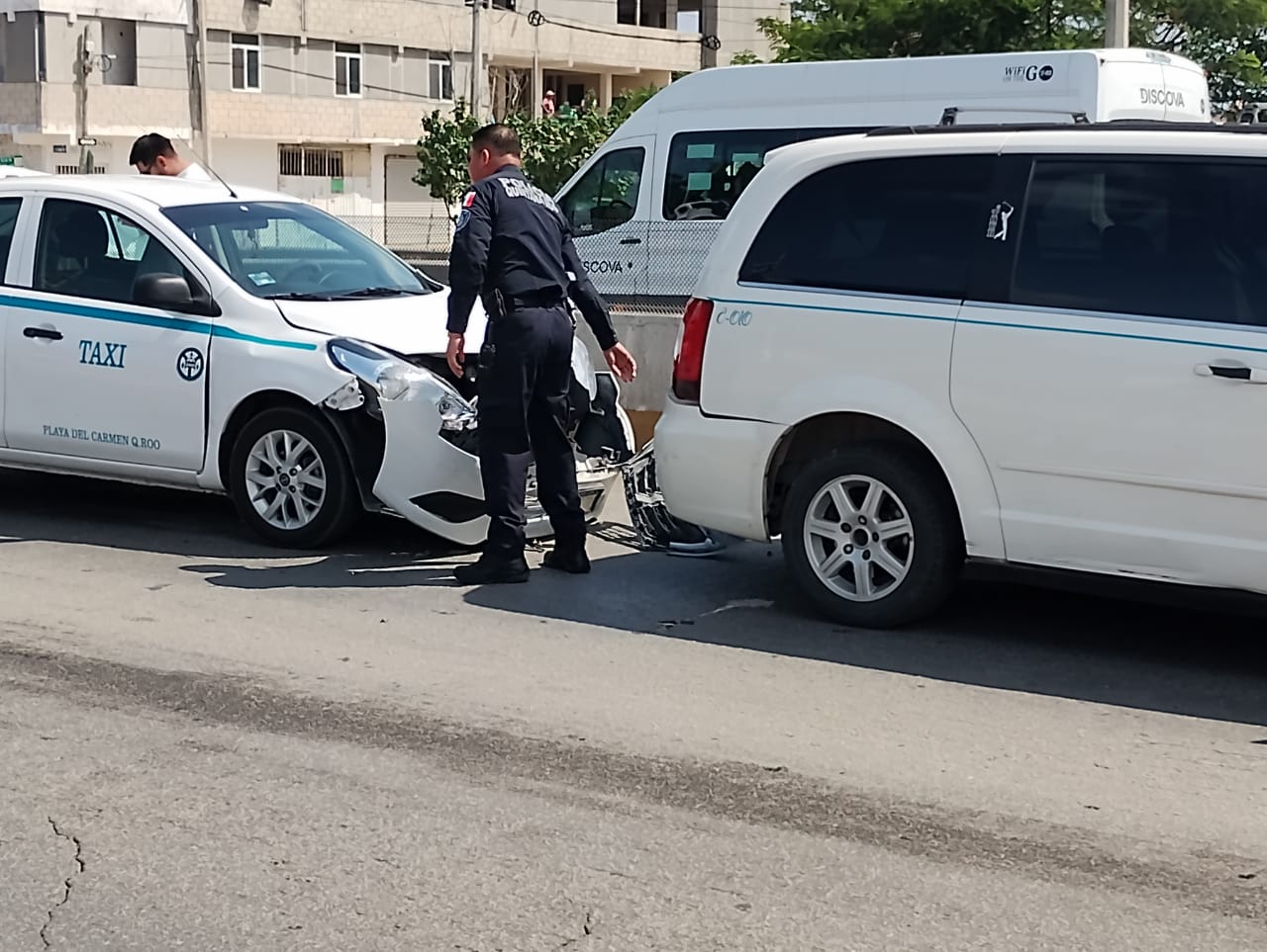 Con datos preliminares se sabe que el taxi van con número económico E-010, frenó intempestivamente provocando que los vehículos que venían detrás de esta unidad, colapsaran unos contra otros provocando daños importantes en al menos 3 unidades.