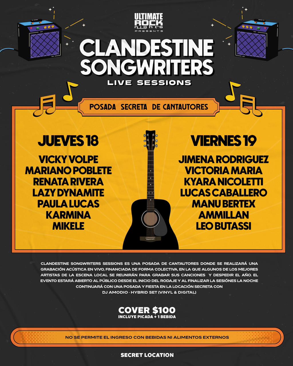 El costo de acceso es de 100 pesos, e incluye una picada y una bebida. Se informó que no estará permitido el ingreso con alimentos ni bebidas externas, como parte de las reglas del evento. La ubicación exacta será revelada únicamente a las personas asistentes, manteniendo el concepto de “localización secreta” que da identidad al proyecto.