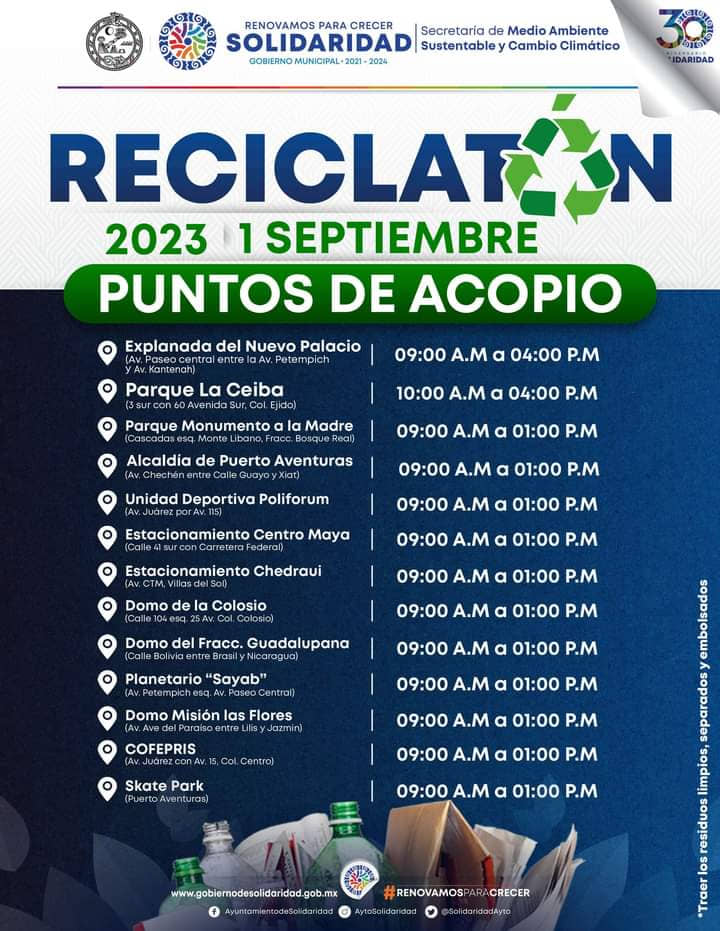 Playa del Carmen, Solidaridad, 29 de agosto del 2023.- La edición 24 del programa “Reciclatón”, desde el inicio de esta administración de la presidenta Lili Campos, se realizará este viernes 1 de diciembre con 13 puntos de acopio, 11 en Playa del Carmen y 2 en Puerto Aventuras.