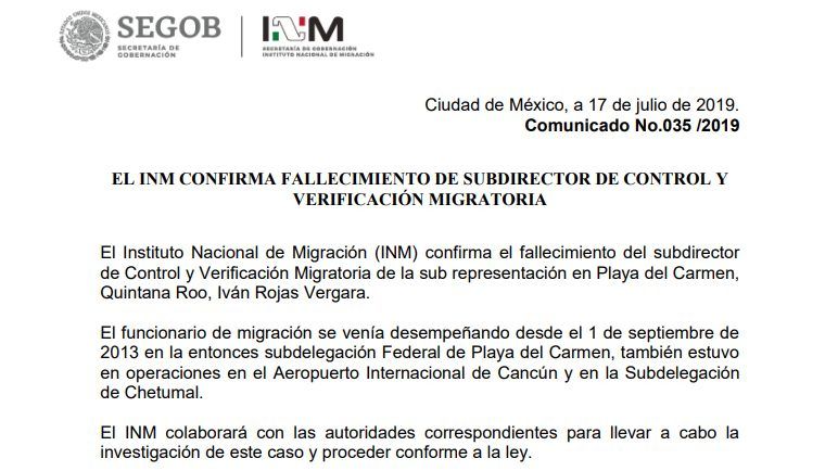 El Instituto Nacional de Migración (INM) mediante un comunicado confirmó el fallecimiento del subdirector de Control y Verificación Migratoria de la sub representación en Playa del Carmen, Quintana Roo, Iván Rojas Vergara.