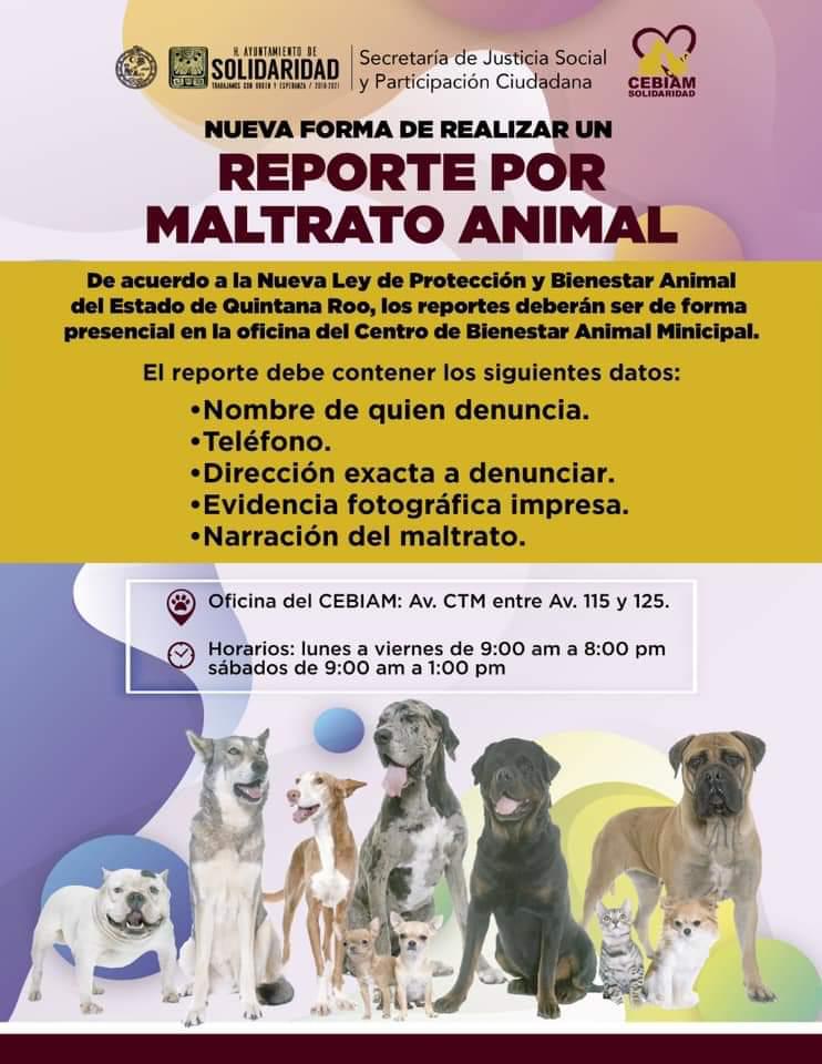 De acuerdo a la Nueva Ley de Protección y Bienestar Animal del Estado de Quintana Roo, los reportes deberán ser de forma presencial en la oficina del Centro de Bienestar Animal Minicipal.