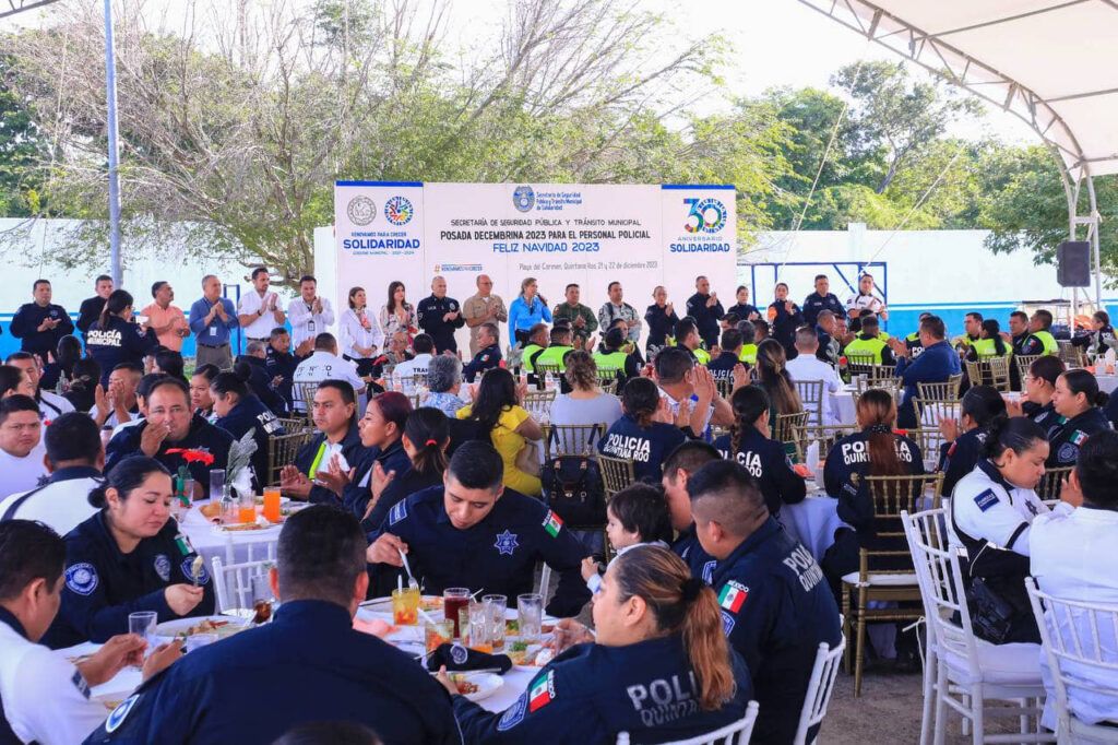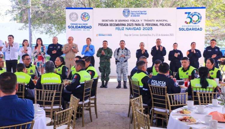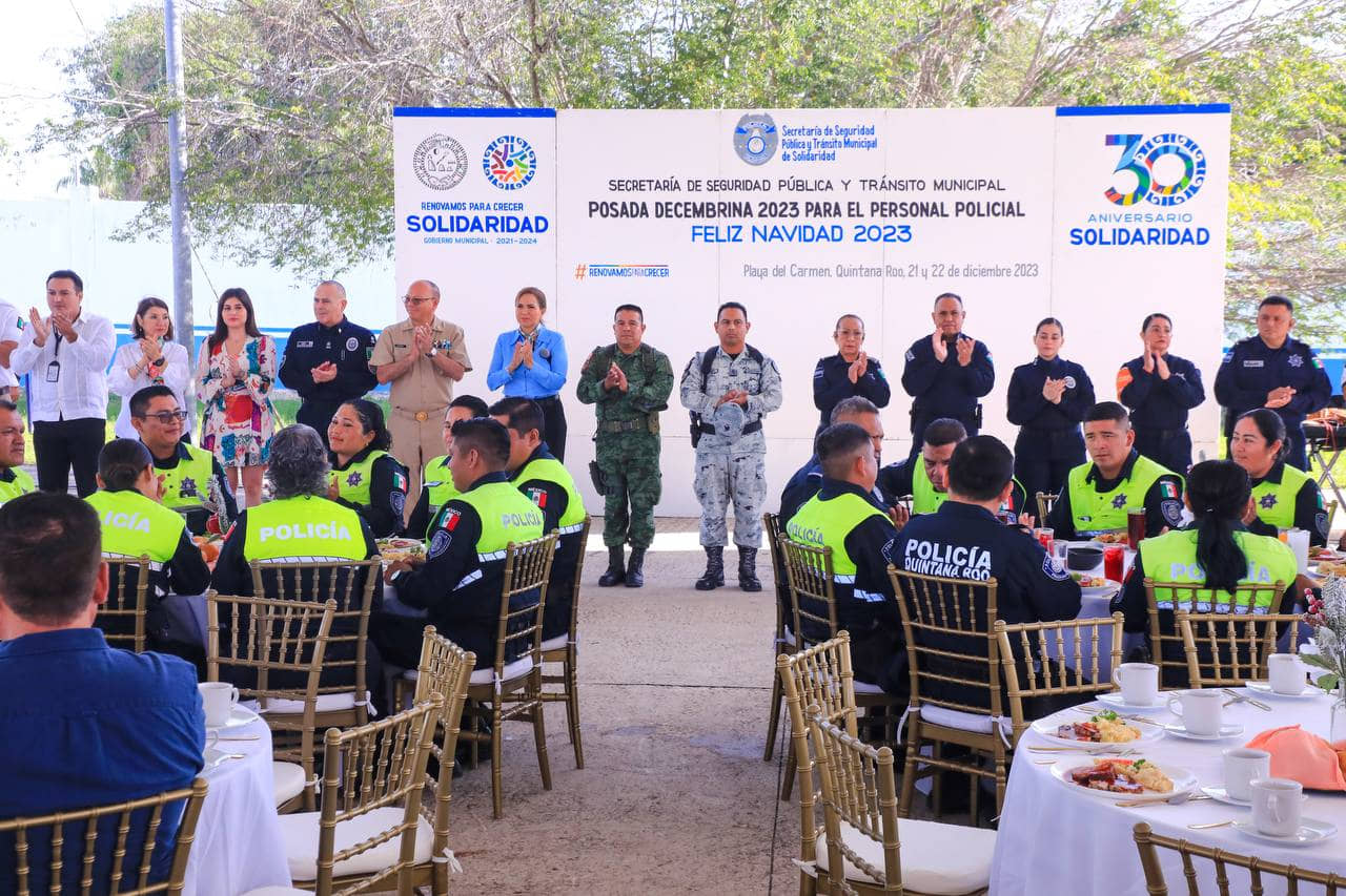 Playa del Carmen, Solidaridad, 22 de diciembre del 2023.- Teniendo como invitados especiales a los integrantes de la Mesa de Seguridad Ciudadana a nivel regional, la presidenta municipal Lili Campos encabezó la posada en la que convivió con los policías de la Secretaría de Seguridad Pública y Tránsito de Solidaridad, en su explanada cívica.